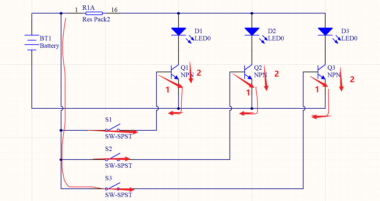 When the liquid in the container is very low, near the level of probe S3, only switch S3 is closed because the liquid provides a conductive path. Current flows into the base-emitter of transistor Q3, driving Q3 into conduction. LED D3 lights. If an operator observes only one LED illuminated, the tank requires refilling. The circuit behavior is shown in the diagram above.