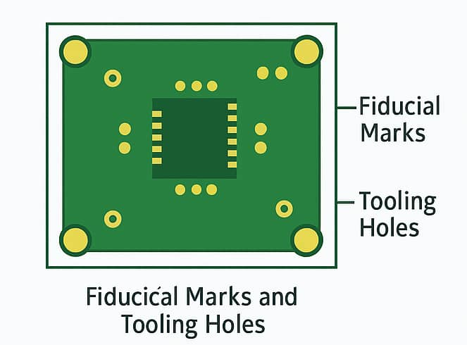 ● Tooling Holes: Small and non-plated, tooling holes primarily assist manufacturing. Typically 1 mm to 1.5 mm in diameter, they are positioned away from the active circuit area and are used for machine alignment during assembly processes.
