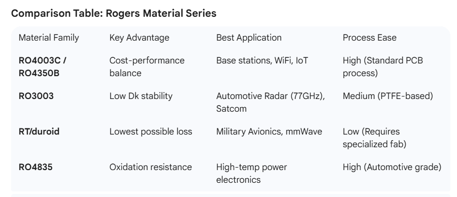 Rather than getting bogged down in every data sheet parameter, it's more practical to choose a material based on your specific project requirements. Different Rogers series are engineered for distinct "sweet spots" in the RF spectrum: